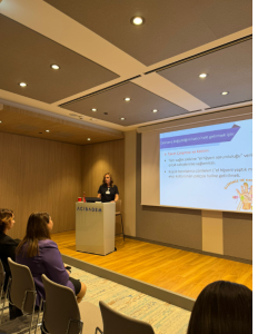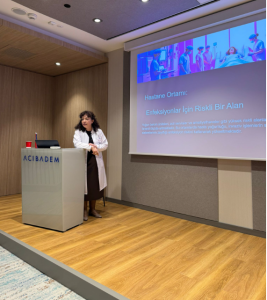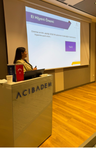 Hemşirelik Hizmetleri Müdürü Sayın Eda Eryiğit Sarıca “Hasta Güvenliğinde El Hijyenin Önemi” başlıklı sunumu paylaştı. Eda Hanım, dünyada ve Türkiye’de el yıkama oranlarını, hasta güvenliğine tehdit edecek durumlardan bahsetti. En çok görülen mikroorganizma etkenleri ile birlikte güncel bilimsel çalışmalardan bahsederek sunumunu sonlandırdı.