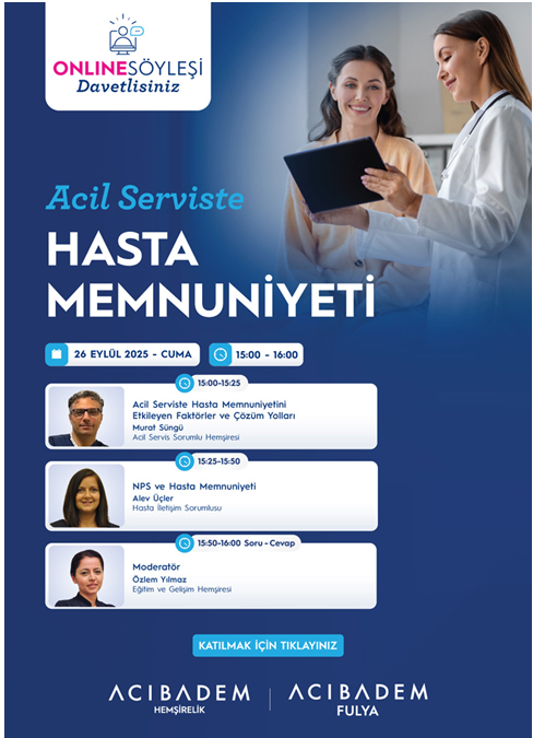 Acıbadem Fulya Hastanesi tarafından düzenlenen “Acil Serviste Hasta Memnuniyeti” Acıbadem Sağlık Grubu çalışanlarına duyurularak webinar üzerinden 26 Eylül 2025 tarihinde gerçekleştirildi.