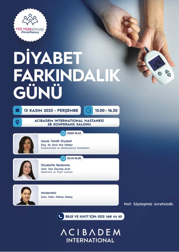 14 Kasım 2025 “Dünya Diyabet Günü” kapsamında 13 Kasım 2025 tarihinde Acıbadem International Hastanesi Konferans Salonunda “Diyabet Farkındalık Günü” söyleşisi 35 katılımcı ile gerçekleşti.