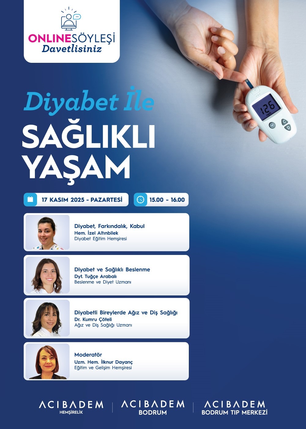 Acıbadem Bodrum Hastanesi tarafından düzenlenen “”Diyabet ile Sağlıklı Yaşam Söyleşi”si Acıbadem Sağlık Grubu çalışanlarına duyurularak webinar üzerinden 17 Kasım 2025 tarihinde gerçekleştirildi.