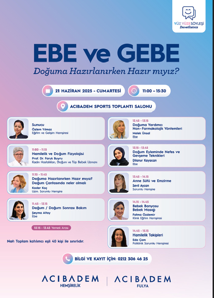 Acıbadem Fulya Hastanesi tarafından düzenlenen “Ebe ve Gebe Doğuma Hazırlanırken Hazır Mıyız?” söyleşisi 21 Haziran 2025 tarihinde 11:00 ile 15:15 arasında Acıbadem Sport Toplantı Salonunda gerçekleştirildi.