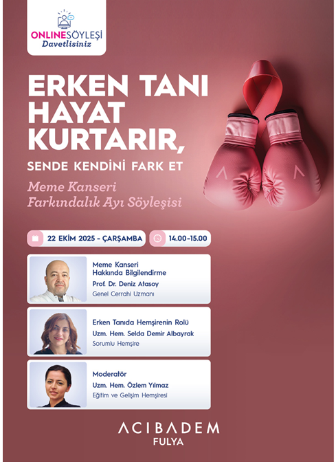 Acıbadem Fulya Hastanesi tarafından düzenlenen “Erken Tanı Hayat Kurtarır, Sen de Kendini Fark Et” Acıbadem Sağlık Grubu çalışanlarına duyurularak webinar üzerinden 22 Ekim 2025 tarihinde gerçekleştirildi.