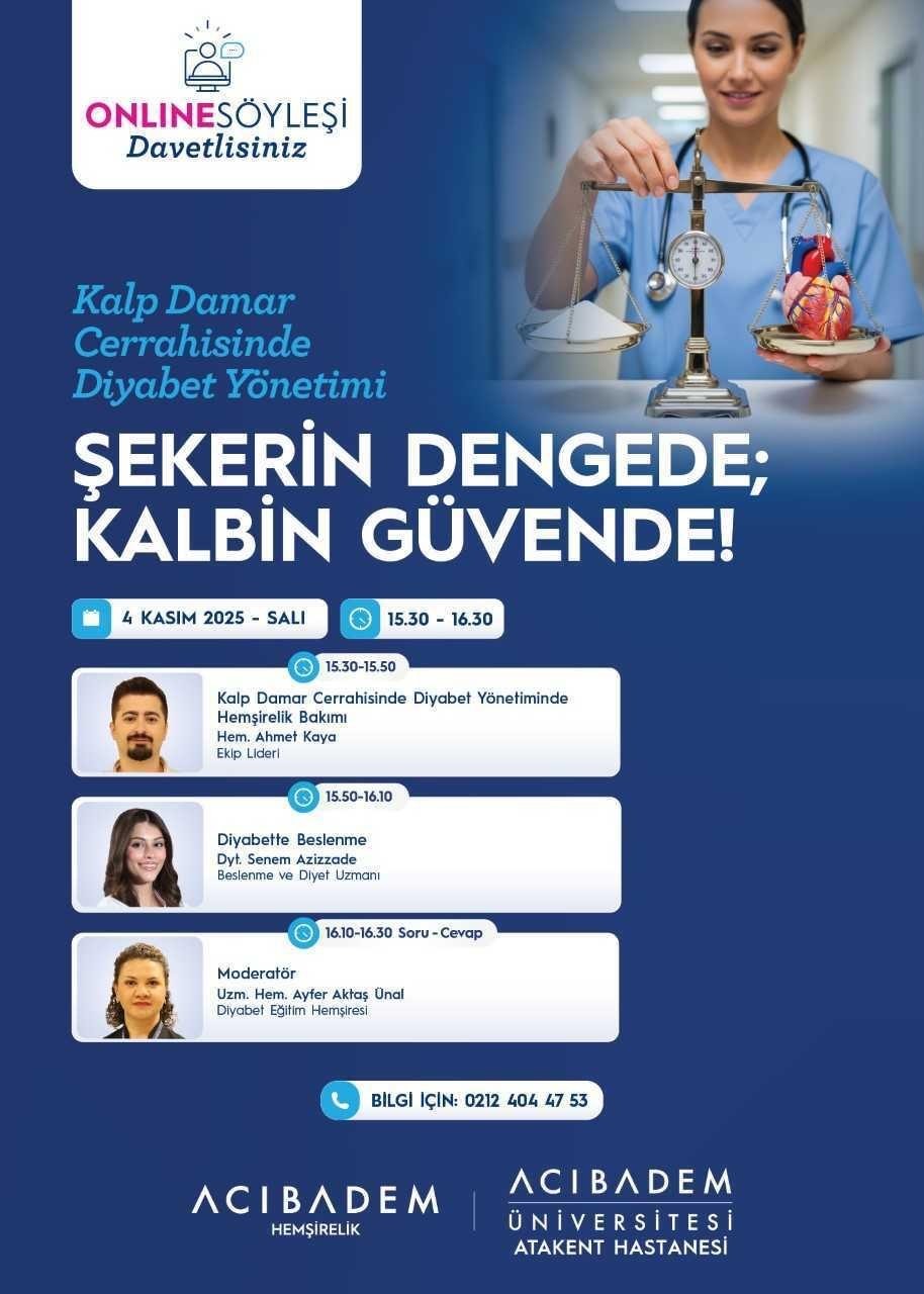 “Şekerin Dengede Kalbin Güvende “ mottosuyla Acıbadem Üniversitesi Atakent Hastanesi’nde 04 Kasım 2025 15.30-16.30 saatleri arasında Kalp Damar Cerrahisinde Diyabet Yönetimi Söyleşisi webinar üzerinden Acıbadem Üniversitesi Atakent Hastanesi Diyabet Hemşiresi Sayın Ayfer Aktaş’ın moderatörlüğünde gerçekleştirildi.
