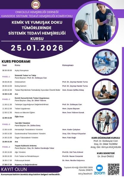 Onkoloji Hemşireliği Derneği tarafından düzenlenen “Kemik ve Yumuşak Doku Tümörlerinde Sistemik Tedavi Hemşireliği Kursu Programı”, 25 Ocak 2026 tarihinde başarıyla gerçekleştirildi. Alanında uzman sağlık profesyonellerini bir araya getiren programa yoğun ilgi gösterildi.